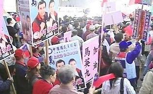 台湾“高等法院”审理马英九特别费案,今天宣告马英九无罪,法庭外的蓝军支持者兴奋高喊“冻蒜”(当选)口号。(东森新闻图)