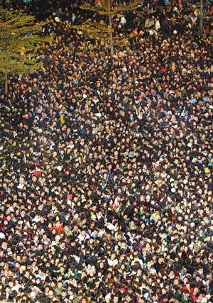 参加昨晚在台北市政府举行的“2008台北最High新年城”跨年晚会的民众,将舞台附近挤得水泄不通。(联合报图)