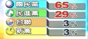 根据TVBS最新的民调显示,各政党支持度方面,国民党65%夺冠,民进党拿下29%位居第二,台联党和新党则各占3%。