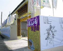 中国台湾网1月3日消息 据台媒报道,岛内一群不满政局混乱的人士在台南县东山乡设立了一个“梁山”山寨,用来讨论时政。山寨围墙用印有108位好汉图像的塑料布幔围绕,今天由前台当局“法务部长”萧天赞打开了山寨门。