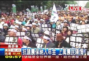 今天上午,上万名农民抗议台当局把农保纳入“国民年金”(图片来源:TVBS)