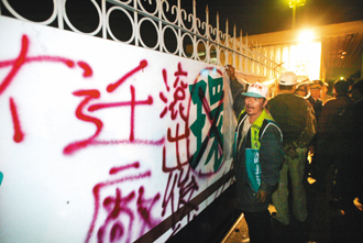 附近居民不满炼油厂接二连三发生意外,喷漆要求“迁厂”。(联合报图)