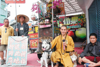 涉嫌性侵的姚姓和尚(右二)6年来带着3名智障徒弟和流浪狗,徒步岛内各县市贩卖佛经光盘。(联合报图)