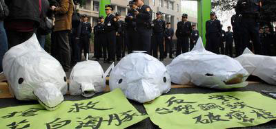 台湾环保团体9日带着纸糊的白海豚,在台当局“行政院”大门外抗议陈情,呼吁拟定白海豚保护计划及行动纲领。台湾“中央社”记者王飞华摄