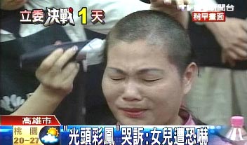 中国台湾网1月11日消息 据台湾TVBS电视台报道,国民党“立委”候选人侯彩凤因为不满对手频频放出风声,指她买票,在今天做出无言的抗议,在马英九及选民面前,剃光头抗议。