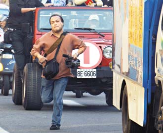 马英九昨天上午陪国民党“立委”候选人扫街拜票,香港记者李东杰抢拍完画面,跑步追赶已向前行进的采访车。(联合报图)