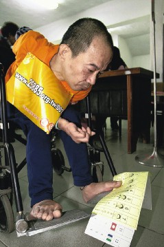 中国台湾网1月12日消息 据台湾《联合报》报道,台湾今天举行第七届“立委”选举,全身多重障碍、只有左脚两趾可动的台北市民许义麟,上午在家人的陪同下用脚投下生平第一张选票。(周先)