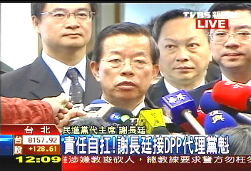 报道称,1月12日岛内“立委”选举,国民党大获全胜,取得113个“立委”席次中的81席,民进党仅得27席,遭到建党以来最大的失败,陈水扁当即辞去民进党党主席一职。12日晚间,经过民进党内高层商议,由吕秀莲推荐民进党2008候选人谢长廷出任党主席,谢长廷也表示“责无旁贷”。