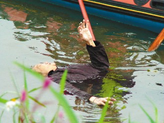 消防队员认为老妇已溺毙,坐着橡皮艇打算将“浮尸”捞上岸。当快要接近时,突然看见老妇眨了眨眼,手微微动了一下,队员吓得大喊。