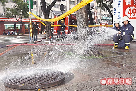 台北市发高压电设备井盖伤人意外,警消人员赶赴现场洒水降温。