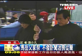 据报道,马英九的岳父日前过世,今天举办公祭,马家人一大早就出门前往殡仪馆。在家祭的最后,马英九跪在老丈人面前,感性地说了一段话,内容大意是说自从和周美青结婚后,让周美青身为公众人物的太太,日子过得相当委屈,也感谢老丈人多年来在背后的支持,希望他能原谅他。