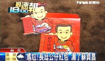 报道称,对此,不少苏贞昌的支持者强烈反映,苏系子弟兵赶紧通过台北县竞选总部,抢在年关前,印出一批刚出炉的长昌公仔红包,比原版多了苏贞昌,但为尊重谢长廷,上面的苏贞昌公仔硬是比谢长廷公仔小了一截。而谢阵营发现红包独漏副手的问题后,春节造势活动也赶紧补做长昌公仔门神。(高大林)