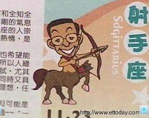 除了封面有意涵,这本农民历里的插图更有趣。星座运势里的射手座又被称为人马座,画面中的人是谢长廷、底下踩着的是马,是否有影射什么,让人有很大的想像空间。