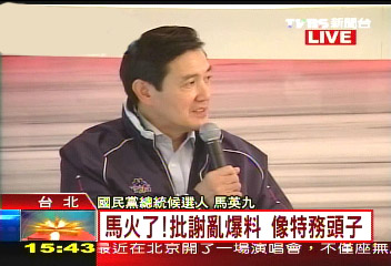 中国台湾网2月4日消息 据台湾媒体报道,在农历新年即将来临之际,国民党2008参选人马英九今天跟网友举办了一场见面会,马英九通过网络向网友拜年。见面会上马英九痛批谢长廷近期的言行就像特务头子。