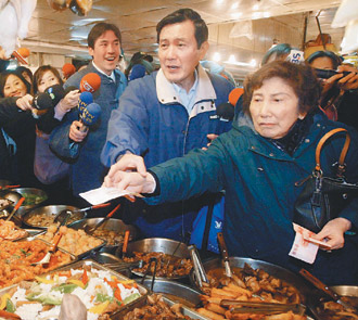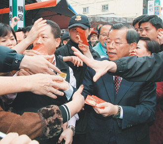谢长廷昨天到台中市天津街年货大街向民众拜年,并发送新台币10元红包,一小时内发出3000个。(联合报图)