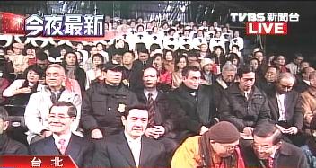 马英九和谢长廷被巧妙安排在法鼓山创办人圣严法师两旁,除了互相点头示意,并没有太多交谈,而因为两人同台,也让祈福仪式增添一点政治味。圣严法师开示,则是呼吁台湾地区领导人选举是君子之争,不出恶言。