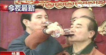 报道指,马英九、王金平昨晚在媒体提议,并且在吴伯雄的撮合下,再度喝起交杯酒,象征国民党的团结。(周先)