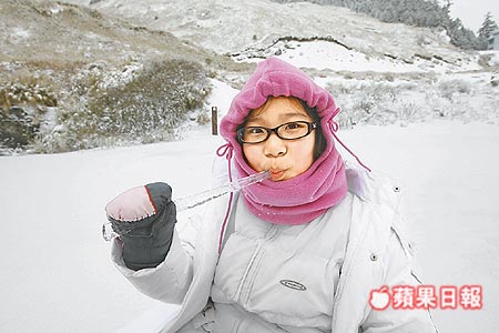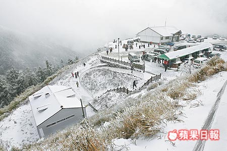 报道说,太鲁阁公园合欢山管理站表示,合欢山的降雪虽在昨天清晨停止,但到了傍晚因水气充足又再降雪,而且奇莱、南湖大山、中央尖山等三千米以上的高山也皆呈现一片雪白,玉山观测站连护栏都被厚雪覆盖。