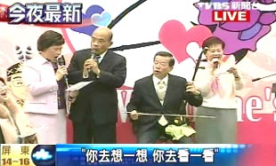谢长廷竞选办公室晚间举行情人节活动,谢长廷、苏贞昌夫妇均出席,两人除了高唱情歌,还自制巧克力,送给夫人和现场的媒体记者以及辅选干部。