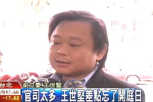 幸好一大早,有记者打电话提醒,王世坚才赶快出门,不过人到了法院,要开什么庭,他自己都搞不清楚。王世坚:“是邱毅的案子吗?”记者:“对。”王世坚:“我被告太多了,我也搞不清楚。”(高大林)