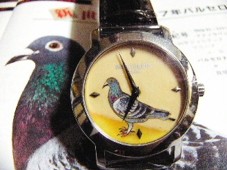 这是瑞士百达翡丽打造的彩绘表,表面上的赛鸽图案是黄良德饲养的“新世纪”,它曾得过世界越洋冠军,现已24岁高龄。