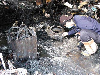台南县六甲乡修车厂3死火警,疑似起火点的神桌已被烧成灰烬,消防局鉴识人员在原来神桌摆放处找寻蛛丝马迹,一尊神像被弃置在图片左方。台湾《联合晚报》记者谢进盛摄