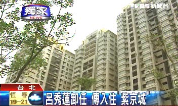 报道称,房屋中介人士透露,吕秀莲已经买下台北县三峡地区的一栋百坪住宅“紫京城”,该处最大的联栋式新屋,每户至少50坪,28层楼高,每坪15到20万(新台币,下同)成交。房价只有台北的一半,1000多万就能买下100坪;而且北大特区和吕秀莲的老家桃园很近,只要10分钟车程。