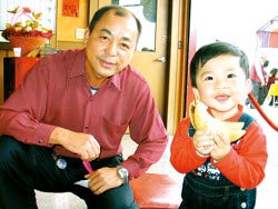 2岁男童苏玟丞连掷了19个圣筊,赢回一辆汽车,祖父苏宝琳(左)在一旁笑得合不拢嘴。(台湾《中国时报》图片)