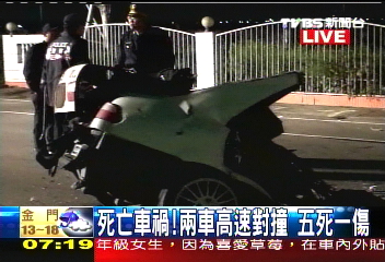 据台湾“中广新闻”报道,台北县警方调查指出,凌晨2点左右,在云林县云145线北港路段,两部分别南下北上的小客车,不知何故,发生对撞,造成这起5死1重伤的重大车祸。