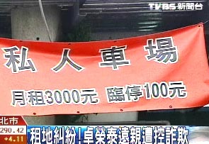 中国台湾网2月26日消息 据台湾TVBS电视台报道,台北市北投奇岩捷运站附近,有一块台北市政府所有的空地,被前民进党秘书长卓荣泰的远亲卓明强承租作为停车场,但附近店家指控,卓明强转租停车场给他们,要求他们当连带保证人,卓明强却没有付租金给台北市政府,导致租车位的人房子反而被查封,而且期间还要给旅游费、茶水费打点官员,店家觉得受骗,要控告卓明强欺诈。
