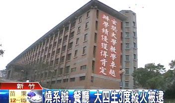 纵火的23岁学生,声称因为对王姓系主任不帮他写报考研究所推荐函,耿耿于怀,一气之下竟然深夜潜入系办公室,点燃报纸引火烧毁布告栏,再到餐饮部以同样方式纵火,隔天嫌犯气还未消,又跑到系办纵火,惊动火警警报器当场被逮。曾国修表示:“这位同学在学校成绩大约中等,是不是有向系主任请求写推荐函,学校方面不是很清楚。”