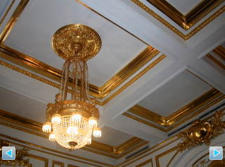 台北宾馆全馆一楼中央广间的“镀金工程”,将纯白的屋顶及墙面都贴上金箔框饰,与百年的水晶灯相互辉映。(台湾东森新闻图片)