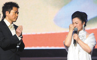 白冰冰(右)在国民党举行的228纪念音乐会中提到女儿被撕票案,讲到激动处一度落泪
