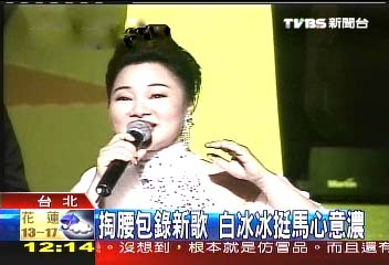 刚刚主持完国民党“228音乐会”,艺人白冰冰昨天又自掏腰包录制新歌,为国民党2008候选人马英九加油打气。这首名为“向前行一定赢”的新歌,由白冰冰本人以及张魁、刘福助等多名岛内本土艺人共同演唱。