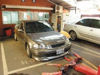 台汐止警方将嫌犯作案弃置的喜美轿车,拖至警察分局采集证物。(台湾《联合报》图片)