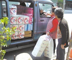 卫生纸飙涨,台湾南部小贩以箱型车兜售杂牌卫生纸,一串5包只要新台币50元,价格是知名品牌的一半,成为抢手货。台湾《中国时报》潘杏惠摄