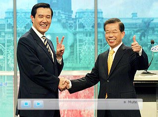 马英九(左)、谢长廷9日参加第二场电视辩论会,双方先礼后兵彼此相互握手,还各自比出手势。来源:台湾东森新闻