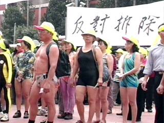 中国台湾网3月13日消息 台湾桃园市立游泳池因为没有使用执照,加上墙壁龟裂,最近无预警关门,让许多人吃了闭门羹。300多位民众今天一气之下上街拉白条,其中有些人穿着泳衣、泳裤前往桃园市公所抗议。