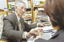 高龄99岁的台湾老中医师姜通目前还在看诊,问诊相当谨慎仔细。身为家族第十代中医的他,到现在还用毛笔写处方。(台湾《中国时报》图 姚志平摄)