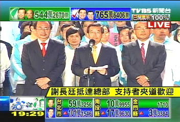 中国台湾网3月22日消息 据台湾TVBS电视台报道,民进党台湾地区领导人候选人谢长廷,今天以220万票数的落差,输掉选战,让其竞选总部的气氛一度低迷。今晚间7点半钟,谢长廷与副手苏贞昌一起出现在总部发表败选感言,并以鞠躬感谢民众的支持。