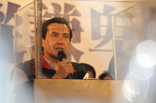 22日晚,新一任台湾地区领导人当选人马英九站在防弹玻璃后向支持者发表胜选感言。当天,马英九以逾200万票的优势击败对手赢得台湾地区领导人选举。(图片来源:台湾联合新闻网)