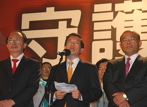 22日晚,在台湾地区领导人选举中败选的民进党候选人谢长廷(中)面对支持者深深鞠躬,他表示承认、并会承受选举结果,也会为败选负起责任,但是他不会离开台湾。谢长廷目前担任民进党主席。此前,谢长廷表示,如果这次败选,将永远退出台湾的政坛。(图片来源:台湾联合新闻网)