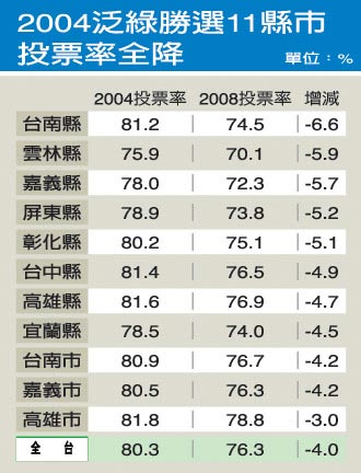 分析各县市投票率,泛绿优势县市选民热情消退,是绿军大败的原因。以2004陈水扁吕秀莲得票超越连战宋楚瑜的宜兰县、台中县、彰化县、云林县、嘉义市、台南县、台南市、高雄县、高雄市等11个泛绿优势县市为例,今年除了高雄市,其余10个县市的投票率都比2004年减少5至7个百分点,降幅超过全台湾平均值。其中,陈水扁的故乡台南县,投票率由2004年的81%降为75%,跌幅是浊水溪以南县市中最高的。