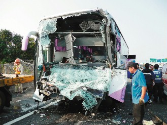 中国台湾网3月28日消息 据台湾《联合报》报道,岛内一辆大客车昨天行经中山高速公路台中县后里收费站,追撞作业中的台“高速公路局”工程车,大客车挡风玻璃全碎,车头严重凹陷,司机范明涤被夹在驾驶座上,出动破坏工具才救出,车祸造成七人轻重伤,其中两人有生命危险。车祸原因由警方调查中。(周先)