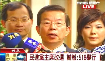 报道称,民进党代理主席谢长廷说:“5月18日选举,5月21日我的计划就是办移交,提前办移交,新的主席就任。”谢长廷并在会中建议,具有民进党公职身份的人员,不应该来参选新的党主席,间接否定民进党秘书长李应元角逐主席的可能性。