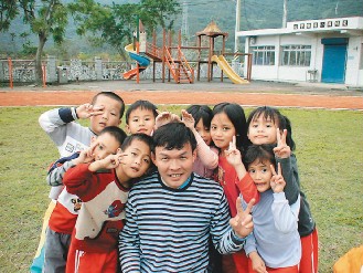 吴明亿飞行103公里,降落地花莲见晴小学学生的热情笑容是最大的奖励。(台湾《联合报》图片)