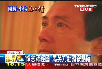 虽然这一次马英九没有在头寮陵寝对蒋经国行下跪大礼,但他仍是深深的三鞠躬,神情肃穆哀戚,眼眶泛红的马英九最后更是忍不住拿出手帕拭泪,或许是因为一时间激动的情绪还不能恢复,马英九也临时取消了原订将在头寮所进行的媒体谈话。 (云鹏)