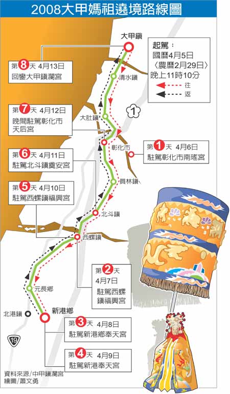 报道指出,今年大甲妈祖绕境进香日程包括,4月5日晚上11时10分起驾; 6日晚上驻驾彰化市南瑶宫;7日驻驾西螺镇福兴宫;8日驻驾新港乡奉天宫;9日上午8时祝寿典礼,晚上仍驻驾新港乡奉天宫;10日驻驾西螺镇福兴宫;11日驻驾北斗镇奠安宫;12日驻驾彰化市天后宫;13日回銮大甲镇镇澜宫。(章潘)