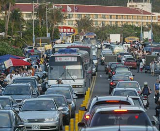 垦丁大街上人潮、车潮涌动。(图片来源:台湾《联合报》)