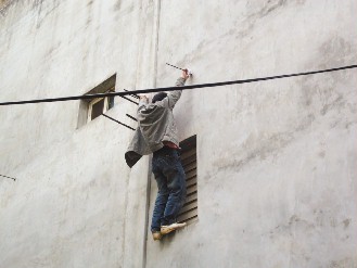 惯窃郑某涉嫌闯空门,被人发现后自三楼窗口爬出,抓着墙边凸出的钢筋,企图逃走。